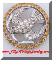 rhinestones. measures 1-3/4 x 1-3/4" $40.00 Vintage Rhinestones ORA Bird of Peace Brooch Quality bird of peace rhinestones circle pin marked ORA. This pin represents the Golden Circle fraternal order. The outer circle is filled with orange round rhinestones and the dove is filled with clear rhinestones and a deep red eye. The bird is in flight with a flowing silver tone ribbon in it's mouth. All of the rhinestones are paste set in silver tone. This pin measures 1-1/4" across and is in wonderful vintage shape. #1102073 $28.00 Vintage OSTBY & BARTON Co. Rose Gold Floral Rhinestones Brooch A beautiful floral brooch marked ->O<- for the Ostby and Barton Company. This brooch is a rose gold with purple rhinestones that are prong set in the center of the flowers. This brooch measures approx. 2-1/2" x 1". issues: slight wear to plating on a couple pedals (see enlarged pictures). #9021242 $45.00 Contemporary Red Rhinestones OTC Brooch A fun glitzy pin marked © OTC. This purse or hand bag pin is red enamel with pave set red round rhinestones. This is a newer piece (about 5 yrs old). It measures approx. 1" x 5/8". #1237047 SOLD PAKULA Baguette Rhinestone Gold tone Leaf Brooch