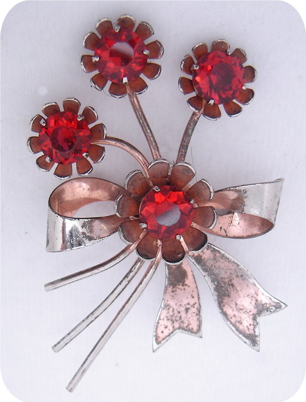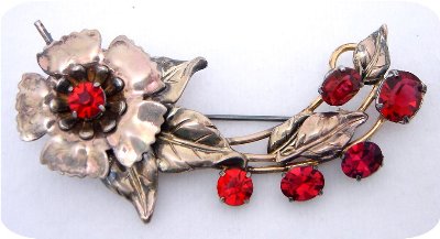 vintage retro modern red rhinestone flower brooch/pin marked Sterling. This