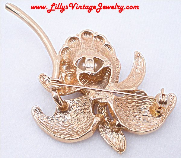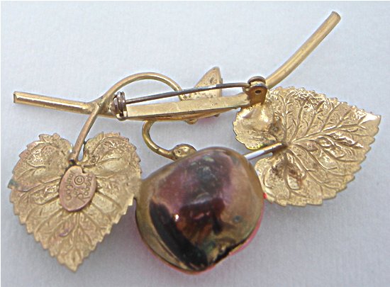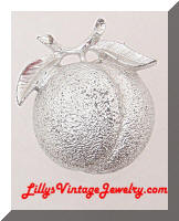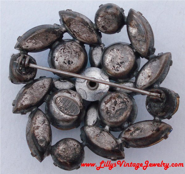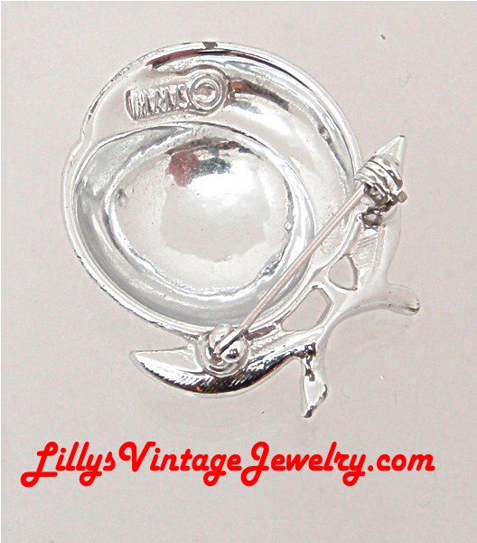 "c" clasps. $45.00 Multi Colors Rhinestones Duette Dress Clips Brooch marked USA Starred S A beautiful art deco brooch that comes apart to be used as a pair of dress clips. This piece is marked PAT. 2085548 on the duette frame. Made USA and an S inside of a star on the backs of the clips. That mark is believed to be one of the marks used by Fred Gray Corp. The rhinestones are all chatons in the colors of red, green, purple, yellow and blue. All of the rhinestones are paste set in gold tone. As a pin, this measures approx. 3" x 1-3/8". #6210818 $85.00 SARAH COVENTRY Fashion Splendor Brooch Beautiful gold tone brooch marked Sarah Cov. Decorated with pink cabochons, faux pearls green marquise and chaton cut rhinestones. measures just under 3" across. Great quality and heft. Book ref: "Collectible Costume Jewelry Identification & Values" by Simonds P. 89 $38.00 Vintage SARAH COVENTRY "Suzette" Poodle Brooch A proper golden poodle brooch named "Suzette". This brooch is marked © Sarah Cov. It is textured gold tone with a red rhinestone eye. This brooch measures approx. 1-3/4" x 1-1/2" at the widest points. #7121012 $30.00 Vintage SARAH COVENTRY Pearls Rhinestones Moonlight Brooch A classy golden brooch marked Sarah Cov. © by the name of "Moonlight" from 1973. This brooch is adorned with faux pearls and clear round rhinestones for accents. This brooch is highly domed and measures approx. 1-7/8" across. #9101010 $38.00 Vintage Sarah COVENTRY Contessa faux Opal RS Brooch Pendant One of the gorgeous brooches made by Sarah Coventry called Contessa. This brooch can also be worn as a pendant necklace as it has a loop at the top. This gorgeous brooch is antiqued gold tone with green, pink and purple rhinestones for accents around the brightly colored faux opal center. This brooch measures approx. 3" x 1-3/4". #1007105 $40.00 Vintage Sarah COVENTRY Silver Adam's Delight Apple Brooch A large brushed silver tone apple brooch marked © Sarah Cov. This brooch was called "Adam's Delight". It measures approx. 2-1/4" x 1-3/4". #1051211 $25.00 Vintage Sarah COVENTRY Mr. Seagull Bird Brooch This lovely brooch is a polished silver tone abstract bird in flight brooch. It is marked ©Sarah Cov. The name of this brooch is "Mr. Seagull". It measures approx. 2-1/4" x 2". #1051211 $25.00 Vintage Sarah COVENTRY Sparkle Lites Floral Brooch A pretty silver tone brooch with clear round sparkling rhinestones in the flowers. This brooch is marked Sarah Cov. and was names "Sparkle Lites". This brooch measures approx. 2" x 1-1/2". #5201229 $30.00 Vintage SARAH COVENTRY Silvery Nectar Peach Brooch Yummy textured silver tone brooch by Sarah Coventry called Silvery Nectar. This brooch measures approx. 1-1/2" x 1-1/4". #927128 $25.00 SARAH COVENTRY Fire & Ice Vintage Brooch Stunning gold tone and textured silver tone brooch by Sarah Coventry called Fire and Ice. This brooch measures approx. 2" across #927127 $30.00 SARAH COVENTRY Silvery Sunburst Vintage Brooch A pretty silver tone spinning sunburst brooch by Sarah Coventry with a faux pearl center. This brooch measures approx. 2-1/2" across. #927126 SOLDVintage un-signed SCHREINER Domed Art Glass Brooch A very cool highly domed brooch that we believe is an unsigned Schreiner. This brooch starts with large glass art glass pedals of green, yellow and black. They look like moss on rocks or spinach, they are glass. Then comes pretty yellow marquise. Then a circle of orange inverted (upside down) round rhinestones around a yellow cabochons center. All of the stones are prong set in gold tone. From the back there is a center re-enforcement ring and a hook and eye or wire, holding it together and strengthening it. This brooch measures approx. 2-1/4" across and about 1" tall (center of the dome). #5210912 SOLDVintage un-signed SELINI Rhinestones Enamel Flower Brooch A gorgeous iridescent pink-peach enamel flowers accented with aurora borealis round rhinestones, orange round rhinestones, pink marquise and orange marquise. This brooch is un-signed but I've only seen this type of enamel and construction design by Selini. The marquise rhinestones have open backs with gold foil showing. This brooch measures approx. 2-5/8" x 2". #417103 SOLD Vintage SHERMAN Blue Rhinestones Floral Picture Frame Brooch A gorgeous brooch marked Sherman. This brooch has light blue baguettes and emerald cut rhinestones in the frame. For the flower are dark blue pear cut and light blue round rhinestones. This brooch measures approx. 1-5/8" x 1-1/4". #5201230 SOLDVintage SORRENTO 1/20 12K GF Hematite Pearls Circle Pin A gorgeous pin marked Sorrento 1/20 12KGF with Hematite cabochons and faux pearls. This pin measures approx 1-1/2" across and is in wonderful vintage shape. #8060734 $30.00 Vintage SPHINX Enamel Rhinestones Peacock Brooch A gorgeous quality brooch marked Sphinx and 2046. This brooch is gold tone with green and blue round rhinestones and dark navy blue enamel. It measures approx. 2" x 1-3/4". Sphinx was a British company started in 1948 and closed in the 90's. For a very short time Boucher Company made pieces for Sphinx in the 1950's but it was to costly to continue. This one of those pieces, compare it to know and marked Boucher peacock pieces. Later Sphinx made pieces for many big names: KJL, Ricci, Jomaz, Butler & Wilson and others. The Sphinx pieces are becoming highly collectible. #9181124 SOLD Vintage STAR Navy Blue Plastic Leaves Inserts Brooch A stylish piece marked Star. This piece is silver tone with navy blue plastic inserts making up a leaf design. This pin is in wonderful shape with no wear besides a small part on the pin stem. The photo shows reflections not wear. This brooch measures approx. 2-1/4" x 1-1/2". #1111106 $30.00 Vintage STERLING Art Modern Heart Rhinestone Brooch A fabulous large Rose gold colored brooch marked Sterling. This brooch measures 4" x just over 3". It has green and purple marquise cut rhinestones that are prong set. There is some wear to the finish so please loo