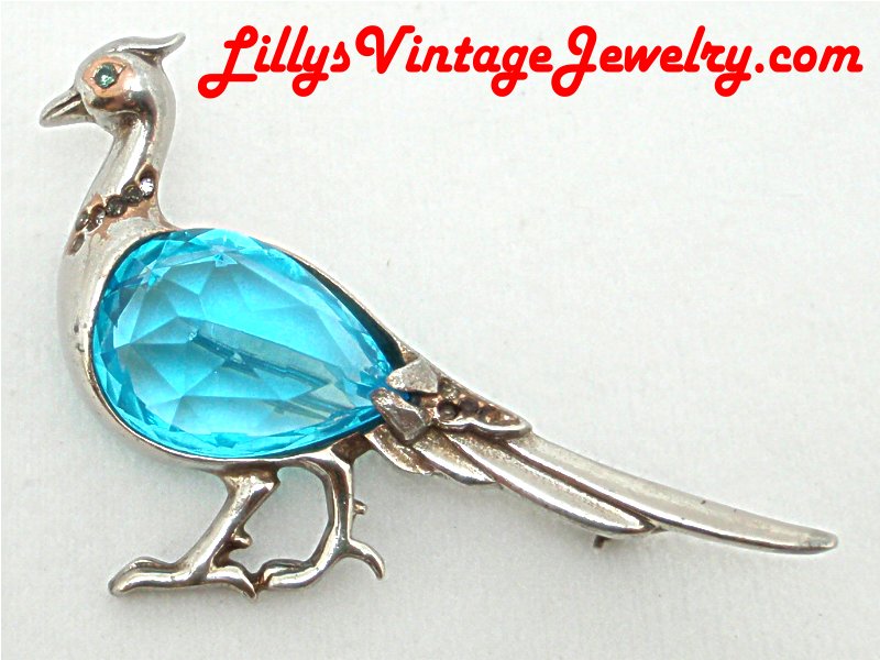 $25.00 STERLING Blue Rhinestone Cabochon Belly Bird Vintage Brooch Pin Wonderful bird in