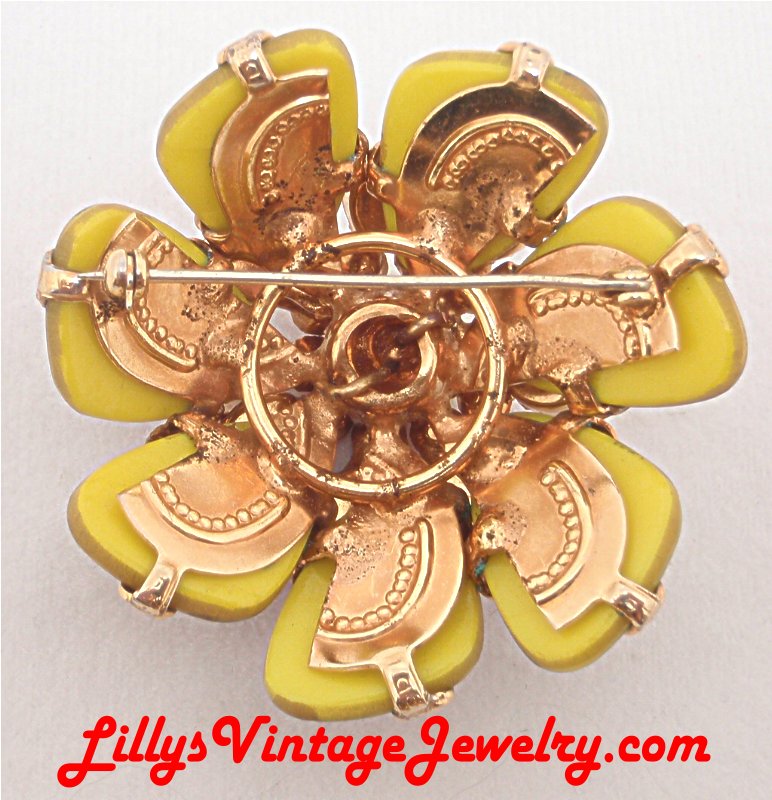 yellow with pave set chaton clear rhinestones. They are gold tone. The larger